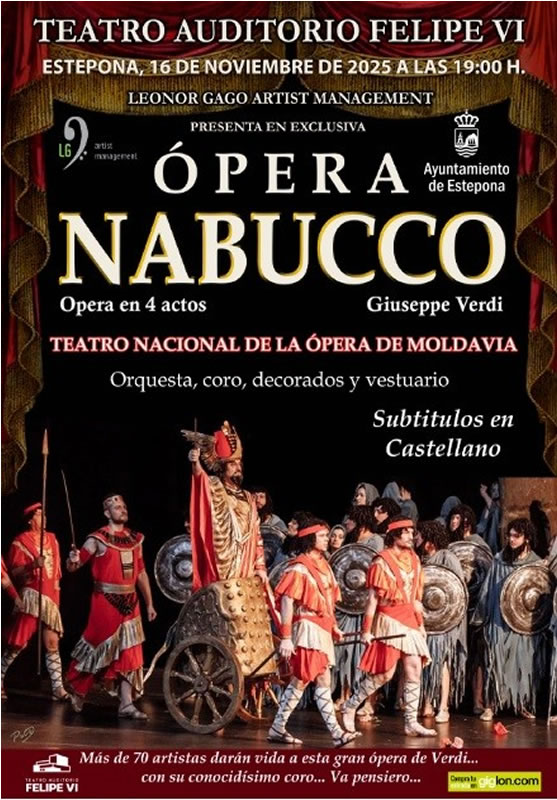 On the upcoming Sunday, November 16, at 7:00 pm, a new and grandiose production of the opera ‘NABUCCO’ by Giuseppe Verdi will be presented at Teatro Auditorio Felipe VI in Estepona. The performance will feature subtitles in Spanish and a cast of over 70 artists, including top international soloists from the National Opera Theatre of…