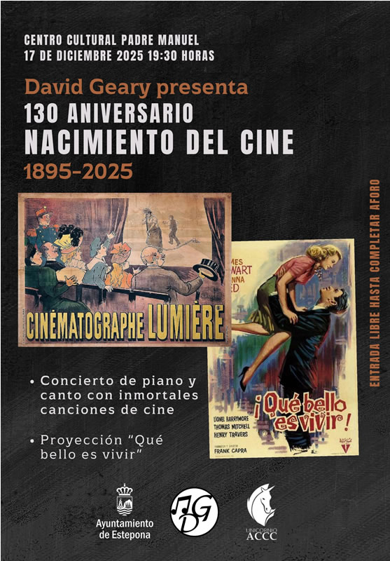 The 130th anniversary of cinema’s birth will be commemorated in Estepona with a film concert featuring international pianist and baritone David Geary on Wednesday, December 17, at 7:30 p.m. The event will take place at the Centro Cultural Padre Manuel, with free entry until full capacity is reached. David Geary, accompanied by pianist María del…