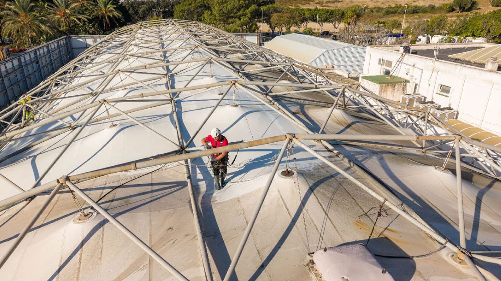 A specialized team is currently performing a thorough cleaning of the exterior canvas of the Exhibition and Conference Center in Estepona. The project involves pressure cleaning with hot water to remove dirt and environmental contamination, as well as waterproofing the roof to enhance building maintenance. Highly skilled operators are using specific equipment and working at…