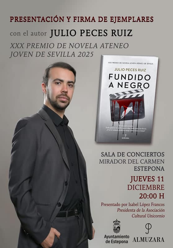 The Estepona City Council has announced that on Thursday, December 11, at 8:00 pm, the Mirador del Carmen Cultural Center will host the presentation of ‘Melted to black’, the latest novel by local writer Julio Peces Ruiz, recipient of the XXX Ateneo Joven de Sevilla Award. The event will be led by Isabel López Franco,…